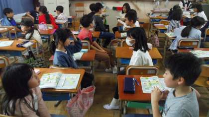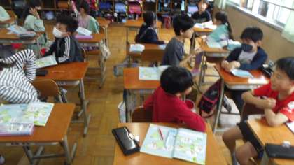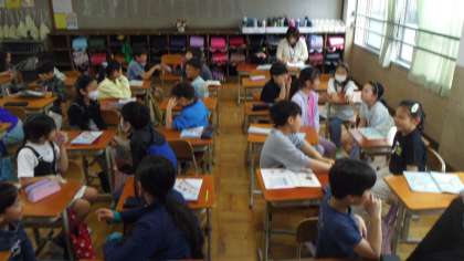 授業の後半にはペアで英語であいさつをして好きなものを伝え合いました。