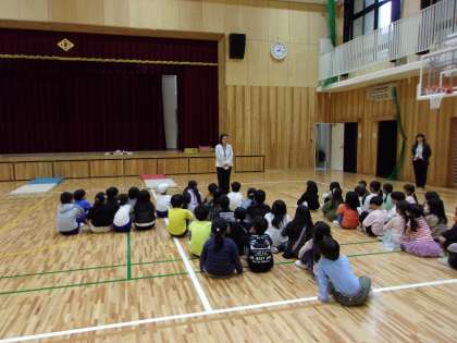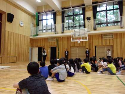 13日(月)の昼休み、アリーナにて放課後まなび教室開講式がありました。