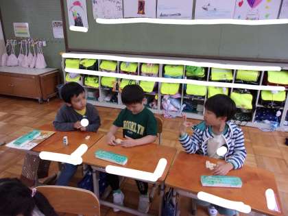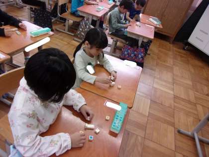 算数の「いくつといくつ」の学習では、数図ブロックを用いて「いくつといくつでしょうクイズ」をしながら、数の分解や合成を身につけています。ぜひおうちでも、身の周りにある小さな物を使ってやってみてください。