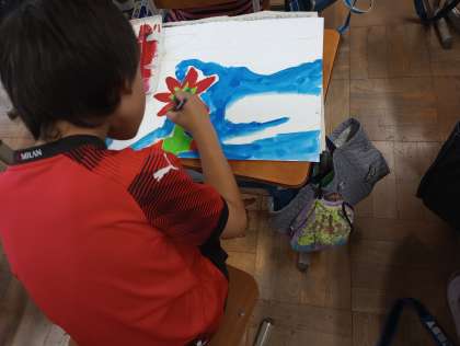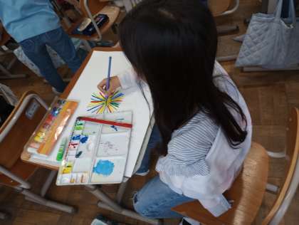 4年生は図画工作科の学習で「まぼろしの花」の作成に取り組んでいます。想像した自分だけのまぼろしの世界の花をあらわせるように花の形や色合い、色の出し方を工夫して取り組んでいます。