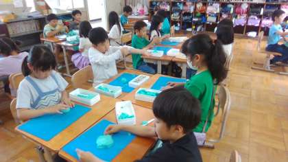 図画工作科で、ねん土を使って、握った形からどんな形ができるかなと考えて、いろいろな物を作りました。「この形は、お花になりそう。」「この形は、恐竜みたい。」といろいろ想像しながら、楽しんで作っている子どもたちでした。