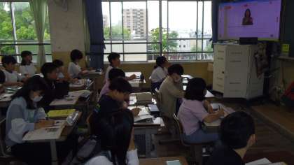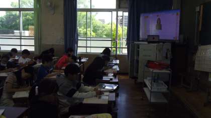 つぎに「文化探検」をしました。デジタル教科書の映像を見てイニシャルや略されたアルファベットを書きました。