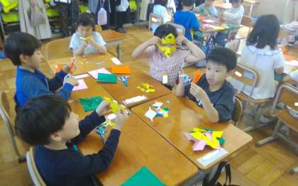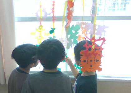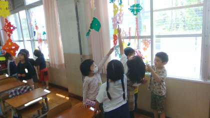 図画工作科「ちょきちょき かざり」の学習で、今までつくってきた飾りを紙テープにつけて、すてきな飾りをつくりました。できた飾りを、教室の好きな場所に飾ると、いつもの教室が色とりどりでにぎやかな教室へと変身し、子どもたちも喜んでいました。