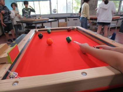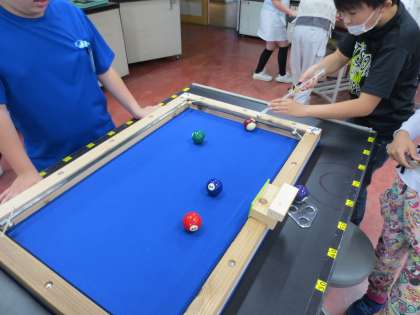 授業の最後には、導入に行ったビリヤードにもう一度取り組みました。初めにしたときよりも、ねらいをもって取り組んでいく姿が見られました。