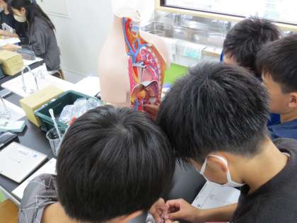 理科の学習で、人の体について調べています。消化器官には、どのようなものがあり、どのような働きがあるのかを、教科書や人体模型を使って調べました。