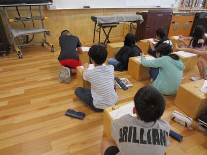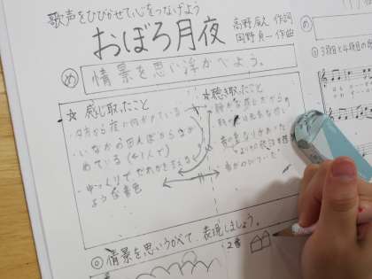 音楽の学習で、「おぼろ月夜」という歌を歌っています。曲を聴き、聴き取ったことと、感じ取ったことを分けながら、曲想を味わって聴いている姿が見られました。