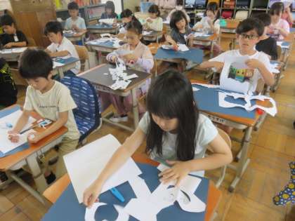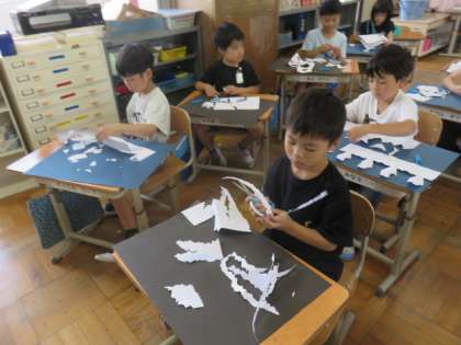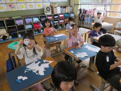 手や体の動くままに、色々な切り方を楽しみました。子ども達は、発想が豊かで偶然できた形を「○○みたい。」とアートの面白さを感じていました。