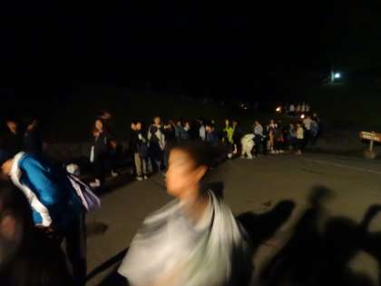 花背山の家1日目の最後の活動はナイトハイクです。グループごとの活動の予定でしたが、朝の雨の状況も考えて、全員で長い列になり夜の山を散策しました。