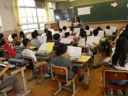 音楽の学習では,音階に気をつけながらけんばんハーモニカの練習を頑張っています。指使いがむずかしくなっていますが,練習を重ねるたびに上達しています。