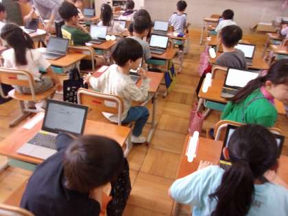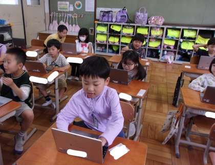 タブレット端末を使用した学習に取り組み始めています。パスワードを入れたり、クリックしたり、初めての作業で苦戦しつつも、うまくできたら「やったー!」「すごい!!」と盛り上がっています。