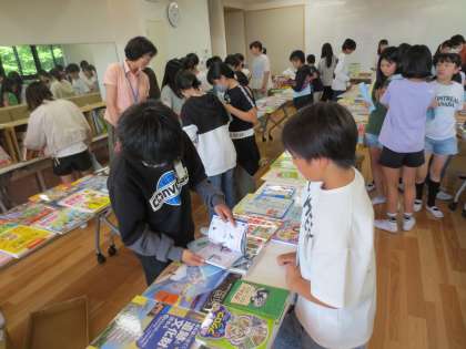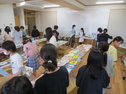 学校の図書館に置いてほしい本を選ぶ、選書会を行いました。大会議室に並べられたいろいろな本を手に取り、本に親しむ姿が見られました。