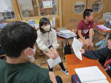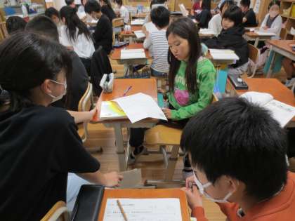 国語科で、「時計の時間と心の時間」という説明文を学習しています。筆者の主張は何なのか、それをより伝えやすくするための事例にはどのようなものがあるのかを考えています。話し合いながら、考えを深める姿が見られました。