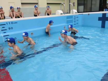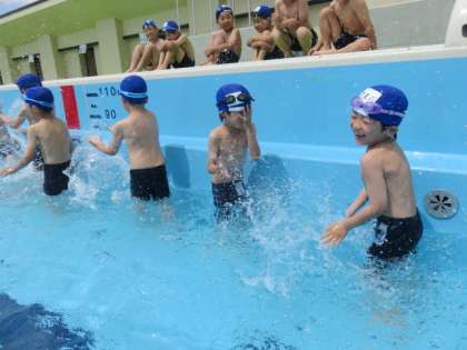 少し肌寒い日が続いていますが、「プール学習」が始まりました。子ども達は元気いっぱい「カニ歩き」をしたり、水をかけ合ったりと笑顔あふれる時間となりました。
