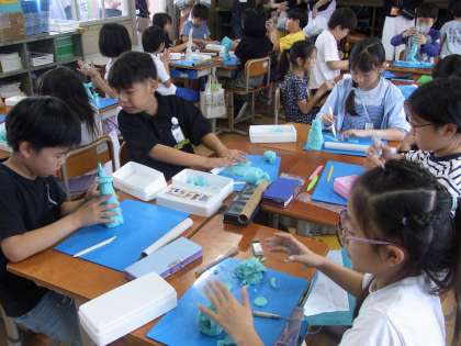 2時間目は図工「立ち上がれ!ねん土」で粘土を高く積み上げました。スカイツリーやビル、キリン、クリスマスツリーなど、さまざまな高いものを粘土で表していました。一人一人積み上げ方を工夫することができました。