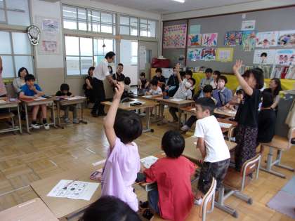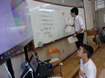 ラストにはビンゴゲームを行いました。ルーレットで出たフルーツでビンゴを目指しました。ビンゴになれば、「What fruit do you like?」という質問に対して、みんなの前で自分の好きなフルーツを答えました。