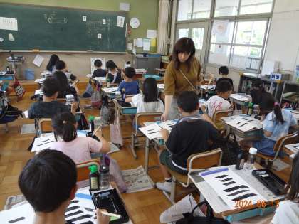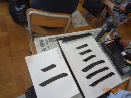 書写の学習では、筆の運びに気を付けて漢字の「二」を書きました。
