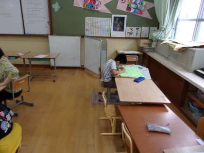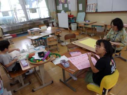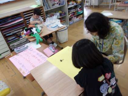 休日参観で行った「やぐるまフェスティバル」。今度は学校中の先生をお客さんとしてお呼びしてお店を開こうと考えています。そのためにそれぞれのお店で準備をしています。