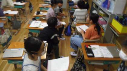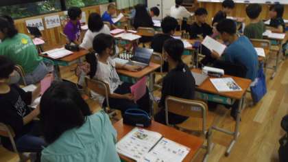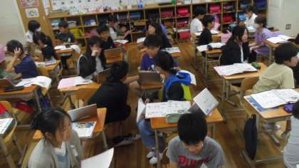 後半にはペアトークで朝起きる時刻、学校へ行く時刻などをたずねあいました。
