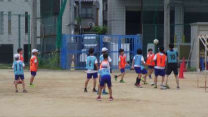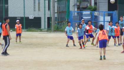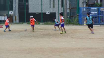 曇りの天気のもと部活動サッカー部の子どもたちはボールを追いかけて走りました。