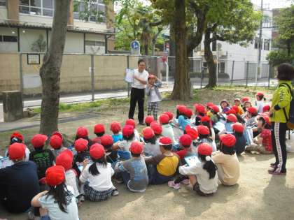 子ども達は,普段の町並みから少し見方を変えて,さまざまな店や工場を見付けていました。最後には、公園で来た道をふりかえりながら「方位」の勉強もしました。