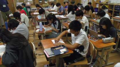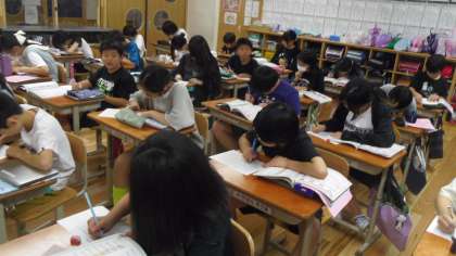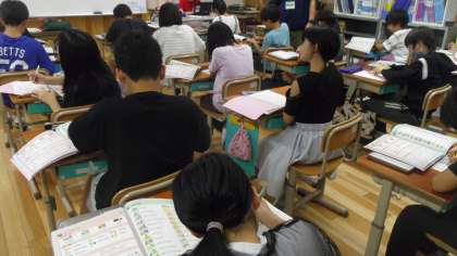 リスニングチャレンジの後に書く活動を行いました。起床時刻、就寝時刻、どれぐらいの頻度でお手伝いをしてるかを教科書を見ながら丁寧に書きました。