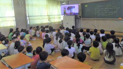 子どもたちは教室でテレビに映る校長先生の話を真剣に聞いていました。校長先生から「未来貯金」の話がありました。