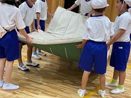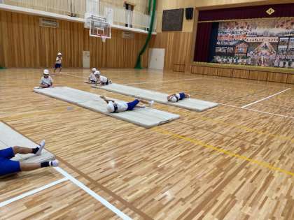 両腕で膝をかかえながら揺れる「ゆりかご」や、丸太のようにころころ転がる「丸太ころがり」など簡単で楽しめる技からスタートしています。