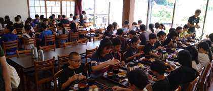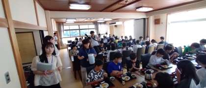 子どもたちはお腹ペコペコ、笑顔いっぱいで食事をいただいています。