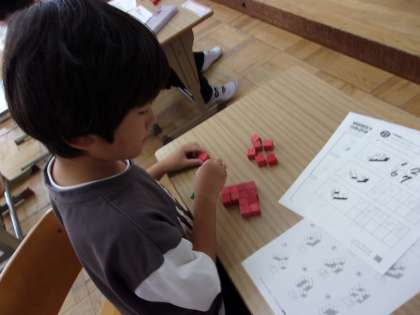 立体の積み木を使って立体の図形を数えたり、何番目の学習をしたりしています。