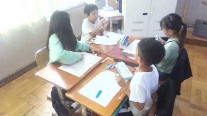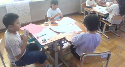 図画工作科の学習で、ストローを組み合わせて動くしくみを作りました。画用紙を切ったり、絵を描いたりして、楽しい人形ができないか試行錯誤する子どもたちです。