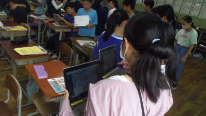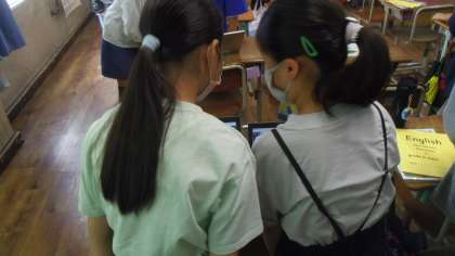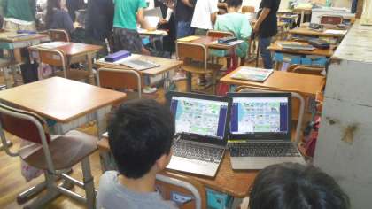 Unit5の6時間目の学習をしました。はじめにペアトークでオリジナルタウンを紹介しあいました。