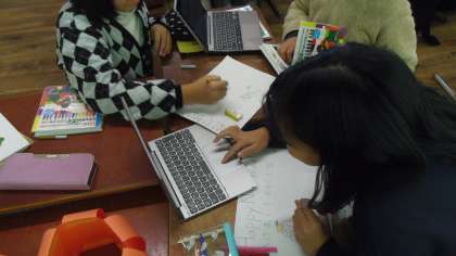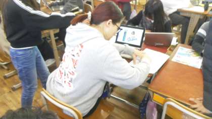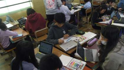 3,4時間目はALTの先生と一緒に学習しました、絵の得意なALTの先生にイラストを手伝ってもらっている人もいました。