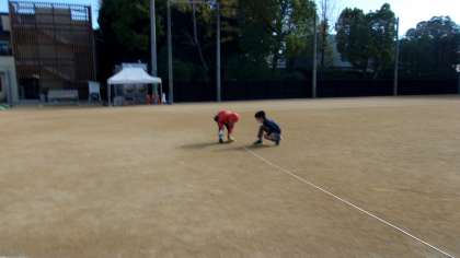 今回、運動場に「1平方センチメートル」、「1平方メートル」、「1アール」をラインカーで描きました。子どもたちで協力して、メジャーを使って長さをはかり、正方形を描きました。
