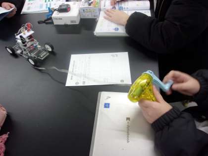 理科の学習で、手回し発電機に豆電球をつないで、明かりをつけたり、ためた電気で車を走らせたりする実験をしています。子どもたちは楽しそうに、自分たちの手で電気をためていました。