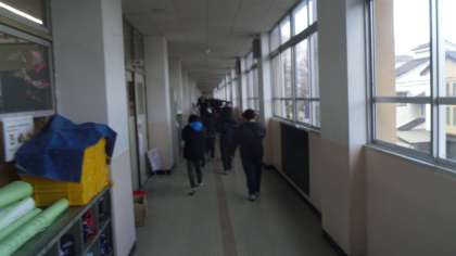地震のあと第2理科室から火災が発生したという想定で子どもたちは運動場に避難をしました。校長先生から30年前の1月17日に阪神淡路大震災が起こったことなどの話がありました。