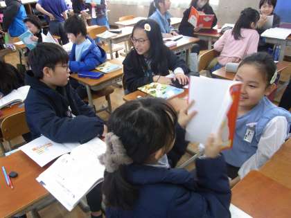 身の回りにある野菜や文房具について、一言で詩を書いています。言葉から連想を広げ、なぜその内容にしたのかや、内容から題名を当てるクイズなどをして、楽しく学習する姿が見られました。
