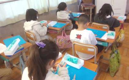 算数科のはこの形で、ストローと粘土を使って、立体的なはこを作りました。ストローをはこの辺とし、粘土を頂点として、はこの形について詳しく調べることができました。