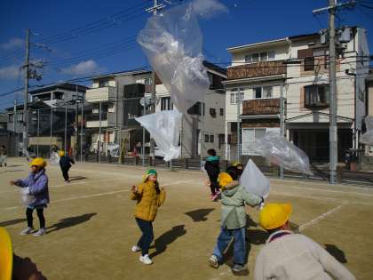 袋に風を集めたり、膨らませた袋を上に投げて風に運んでもらったり…