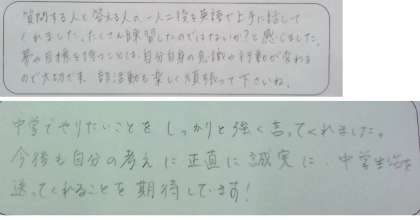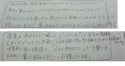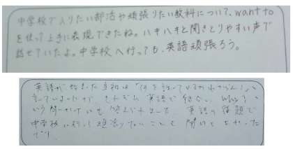 6年外国語科「家の人に中学校で入りたい部活動や将来の夢を伝えよう。」の宿題にご協力をいただきまして、誠にありがとうございました。保護者の方々がお書きいただきました感想の一部です、