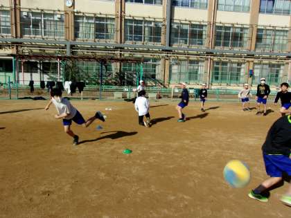総合運動クラブでは、みんなで考えたスポーツや運動遊びを実施しています。ドッジボールをするときは、学年問わず白熱しています。6年生の優しさも見られています。
