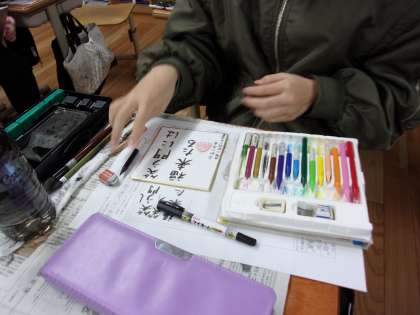 書写の学習で、地域の人のために色紙を作成しました。それぞれが言葉を選び、気持ちを込めて書く姿が見られました。