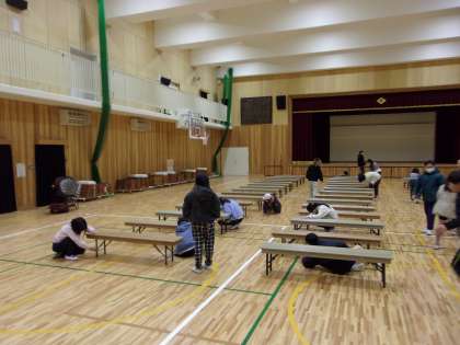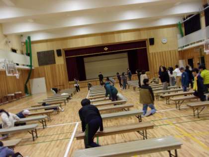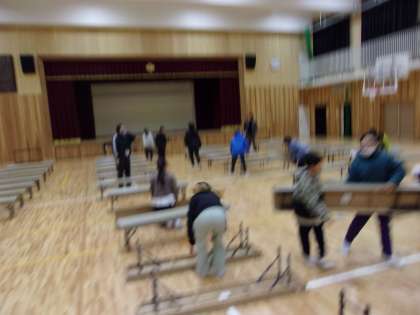 13日(木)、5年生は朝の時間に半日入学・入学説明会のためにアリーナの長椅子並べを行いました。