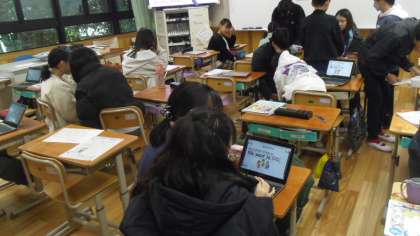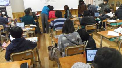 次に各自のギガ端末を使って表現や単語の練習をしました。友達と一緒に練習をしている人もいました。外国語科の授業えは学習に関する立ち歩きや離席を認めています。