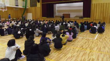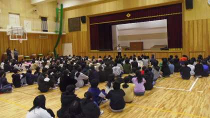 アリーナで今年度の部活働閉校式が行われました。学校長と部活動担当教員から子どもたちに話をしました。