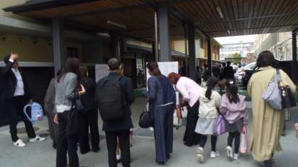 薄曇りのもと入学式が実施されました。家の方と一緒に新1年生が小学校の門をくぐり、受付場所に進んでいきました。