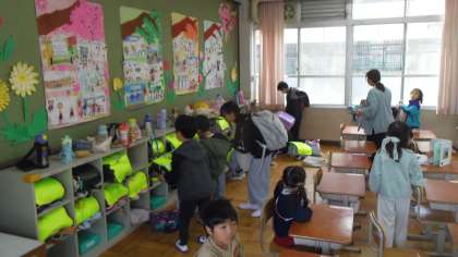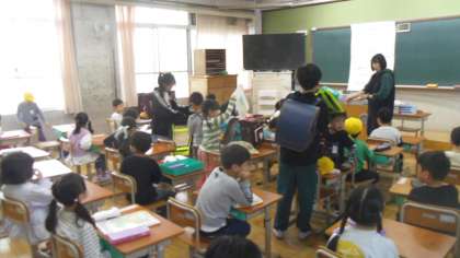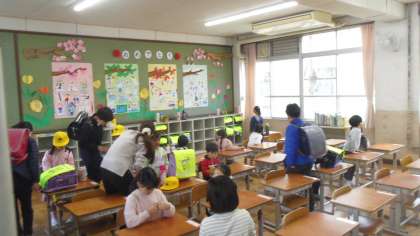 1年生の子どもたちは初めて教室に入りました。6年生がロッカーの場所や机の場所などを優しく教えてくれていました。