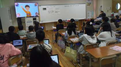 Unit1の3回目の学習をしました。はじめに歌を歌いました。3回目で歌える子どもが多くなってきました。