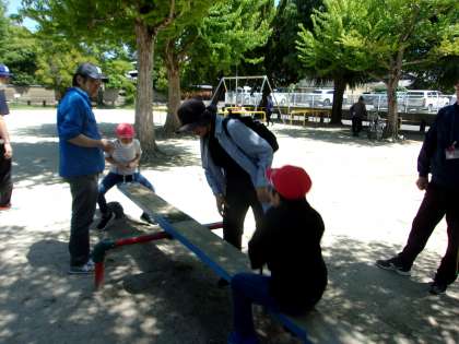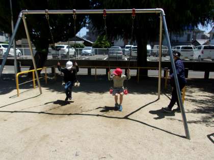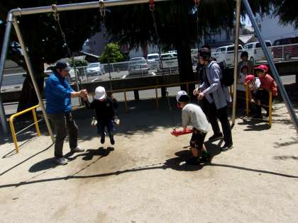 今回のめあては、「ちいきのしせつやこうえんにしたしもう」ということで、公園で楽しく遊びました。集合して全体でのお話を聞いた後、ブランコ、シーソー、ジャングルジムの順番に1つずつ使い方について確認しました。