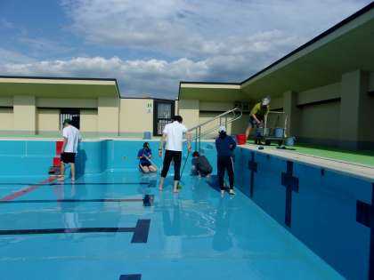 30日(金)、6年生のプール清掃のあと、教職員のプール清掃の仕上げをしました。