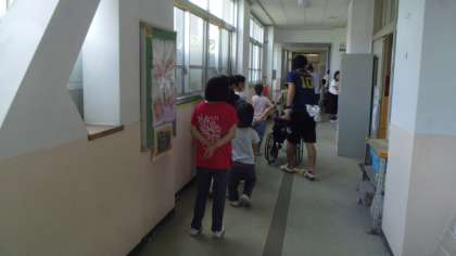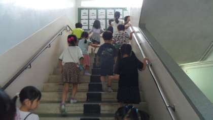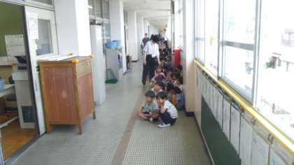 天神川が大雨で氾濫して西院小付近が浸水するという想定で避難訓練を行いました。1階の教室で学習している矢車学級、1年生が2階に避難しました。